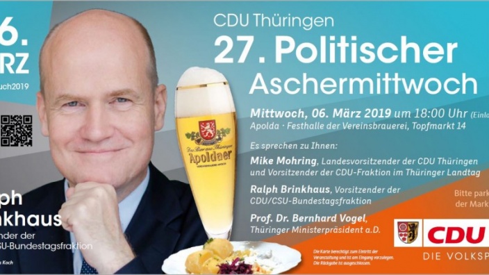 07.02.2019 Einladung zum 27. Politischen Aschermittwoch Anmeldungen in unserer Geschäftsstelle,oder in der Kreisgeschäftsstelle Weimarer Land: (cdu.weimarerland [at] arcor.de), (03644/558735)